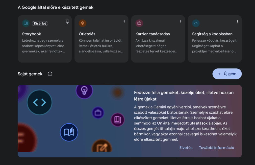 A Gemek a Gemini testreszabott változatai, amelyeket a felhasználók specifikus feladatokra és munkafolyamatokra taníthatnak be. Létrehozhatunk például egy Gem-et, amely a cég marketing anyagainak hangnemében ír szövegeket, vagy egy másikat, amely a belső szabályzatok alapján válaszol a kérdésekre. Ezzel rengeteg időt takaríthatunk meg, hiszen nem kell minden alkalommal újra és újra megadni ugyanazokat az instrukciókat a mesterséges intelligenciának.